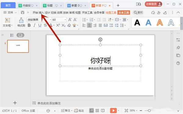 1、打開我們要設置的ppt,點擊上方菜單欄中的“插入”;