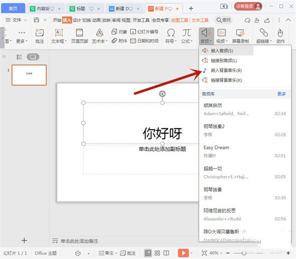 2、然后點擊音頻下拉中的嵌入背景音樂,點擊目標音樂嵌入;