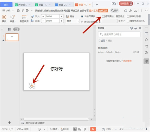 3、此時出現一個音頻圖標,我們取消勾選“循環播放,直至停止”,然后將音頻圖標直接刪除,背景音樂就會消失了。