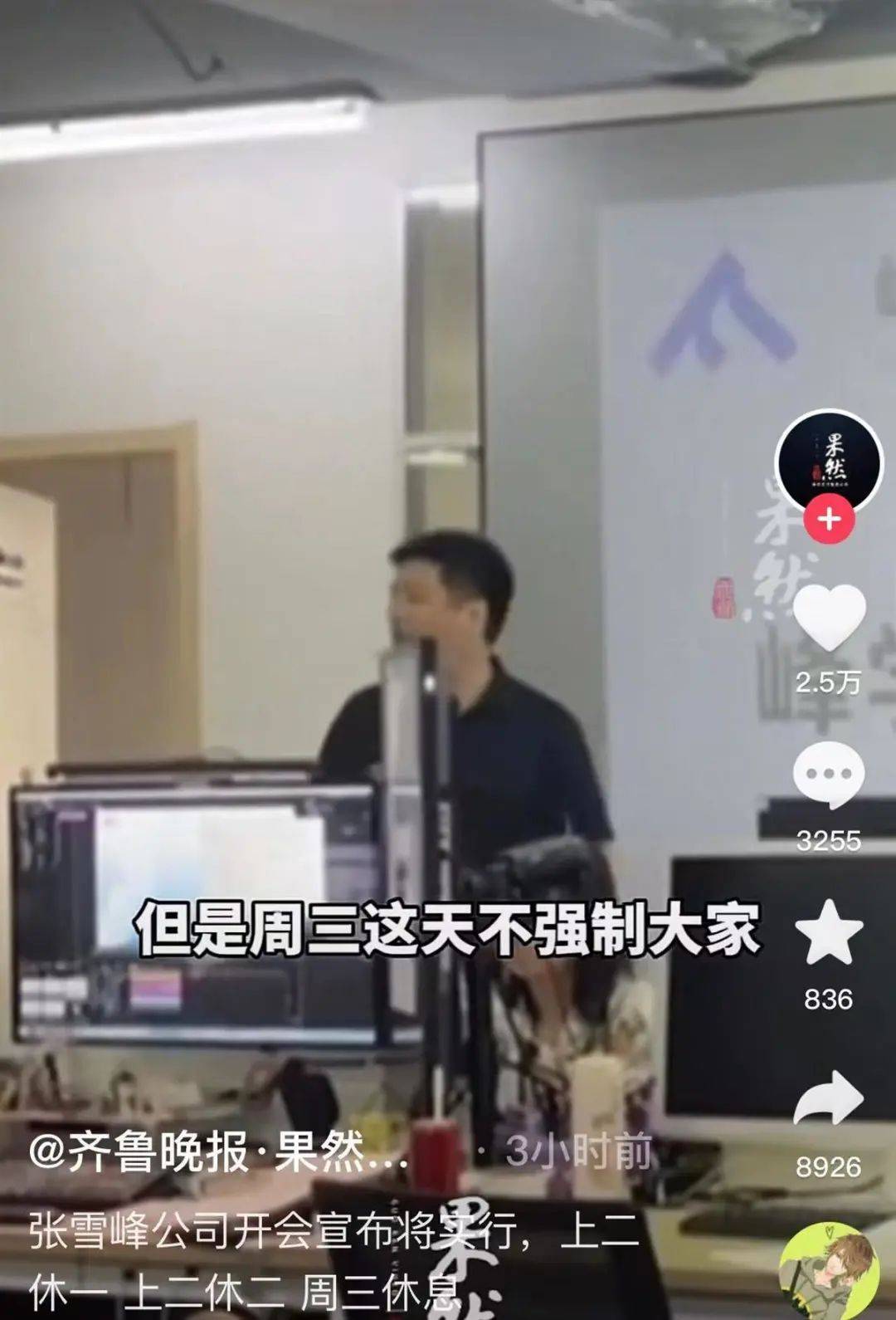 5月31日,江蘇蘇州,張雪峰公司開會宣布將實行,上二休一,上二休二,周三休息,工資待遇不變!