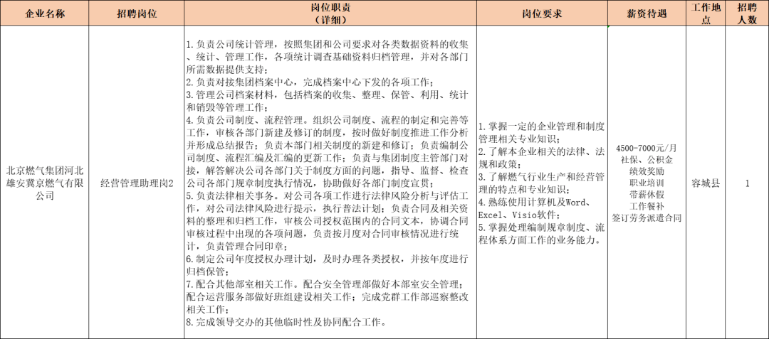 北京燃氣集團河北雄安冀京燃氣有限公司招聘公告