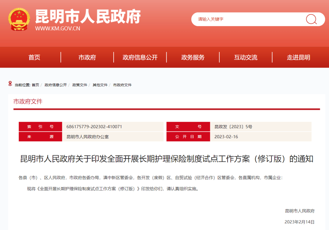 近日,云南省昆明市發布了《關于全面開展長期護理保險制度試點工作方案(修訂版)》,明確自2023年3月1日起,逐步擴大長期護理保險參保范圍和保障范圍。