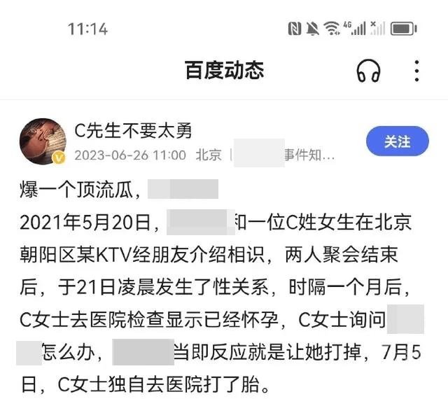 據九派新聞此前報道,6月26日,網友“C先生不要太勇”爆料稱歌手蔡某某與C姓女生一夜情后致對方懷孕打胎,瞬間引爆網絡。