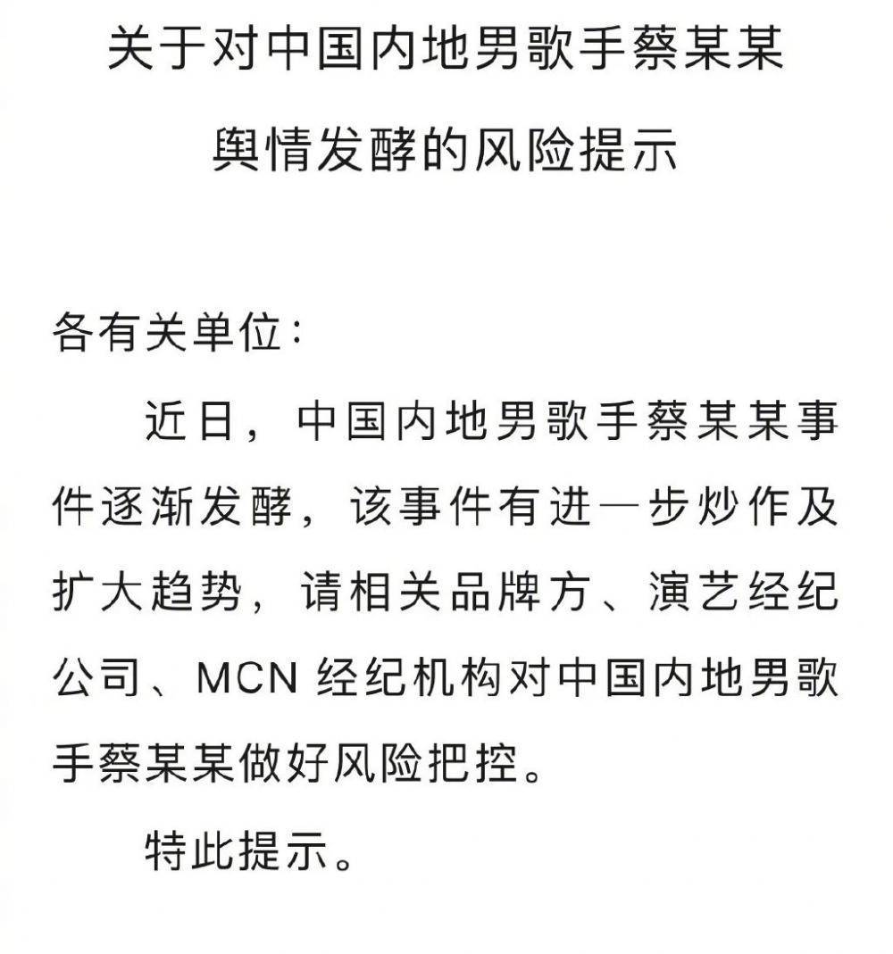 7月1日晚,北京廣告協會明星代言規范委發布關于對中國內地男歌手蔡某某輿情發酵的風險提示。該提示稱,近日,中國內地男歌手蔡某某事件逐漸發酵,該事件有進一步炒作及擴大趨勢,請相關品牌方、演藝經紀公司、MCN 經紀機構對中國內地男歌手蔡某某做好風險把控。