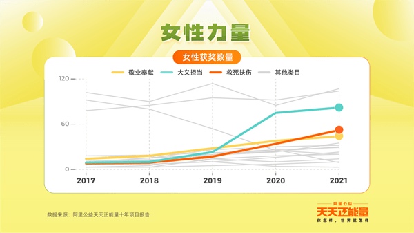 十年里,女性力量日益顯現。從早期以“孝老愛親”為代表的傳統美德,到疫情中女性“大義擔當”、“救死扶傷”行為占比的急劇增加,一次次挺身而出的她們,撐起的不止半邊天,而從2020年起,“巾幗”一詞越來越多的出現在“天天正能量”給獲獎者的致敬語里。
