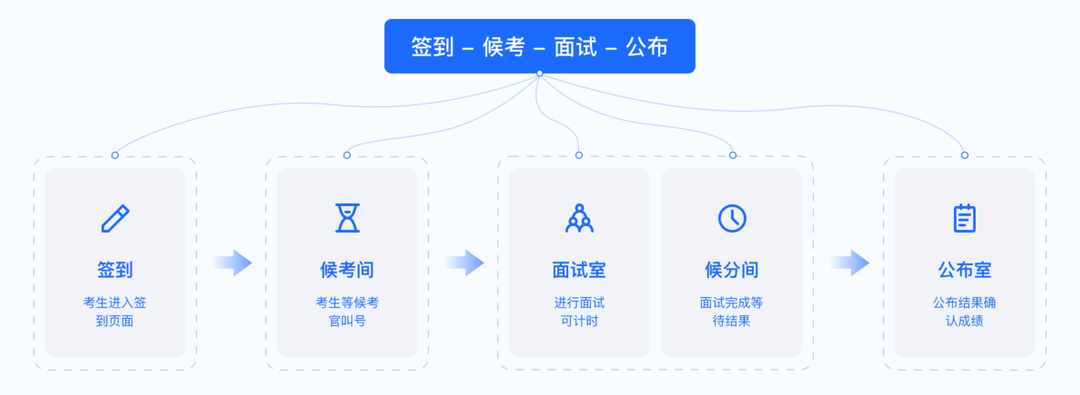 正式面試時,猿圈考務保障組設立了多個面試房間,候選人6人一組按照號牌依次進入,面試官可及時看到面試人員狀態,根據節奏合理安排面試,期間猿圈系統為雙方提供了音視頻、文件傳輸、白板演示、編寫代碼等互動方式,讓候選人實力充分展現。HR根據面試官給出的評分及評語,決定面試通過人員。