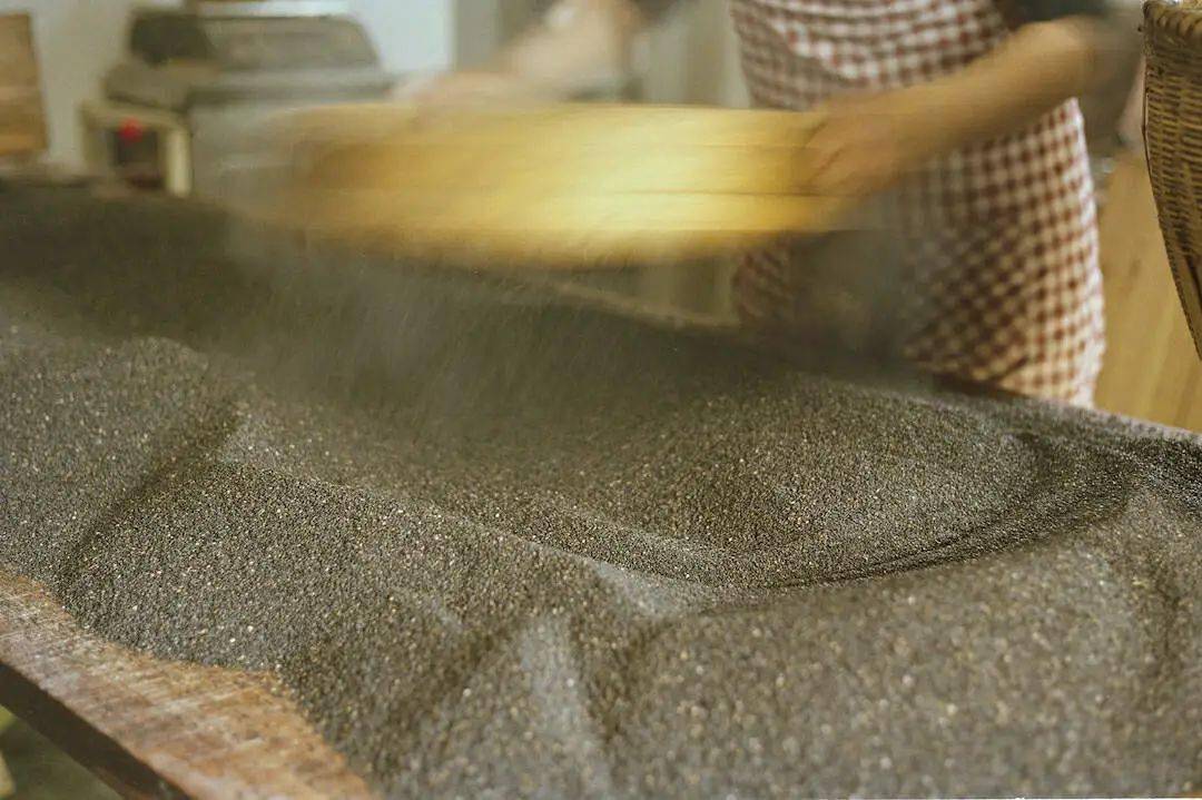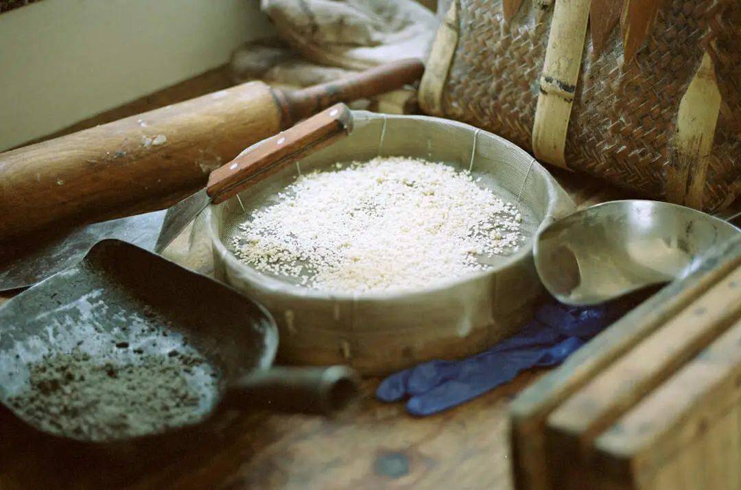 朱傳民的生產車間就設在一樓,一張木頭大桌子的一角堆著炒過的黑芝麻,一些機器和工具靠墻擺放。這個房間雖然總和面粉芝麻一類塵埃般輕細的食物打交道,但還是被拾掇得整潔利索。后廚的一臺機器還在運行,朱傳民說這是在過濾生芝麻中的沙子。他身形精瘦,大概因為每日要花很多力氣搟壓酥糖。我去參觀時已經接近黃昏,他說我去得遲了,他今天的工作剛結束。