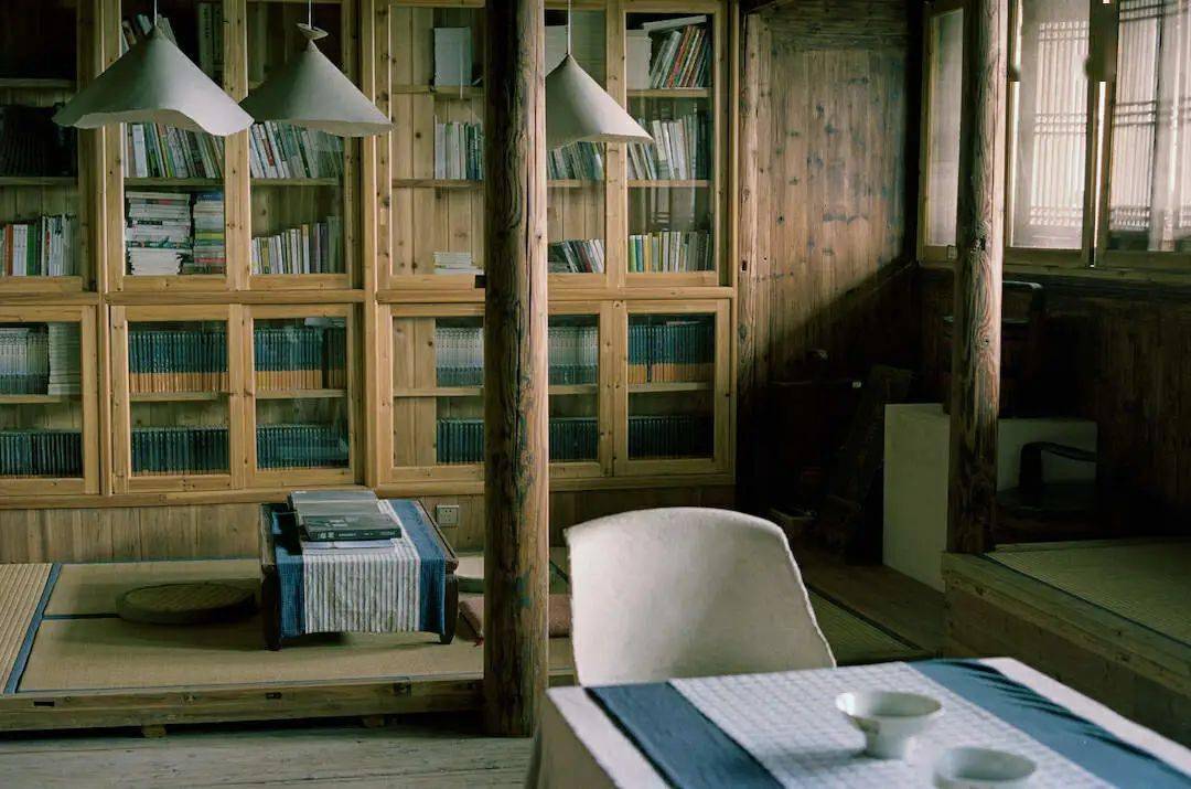 眼前的此情此景雖已抽離了傳統生活的語境,我仍好像受到了這份莊重的感召,一下子入了戲,覺得自己儼然一位宗族大家長。但是太師椅坐久了實在不舒服,我很快站起來,隨邢瑞往二樓走。二樓用作書房,空間非常通透,兩端鋪著榻榻米,中間是一條長桌,擺著茶杯。隨著窗戶向兩邊折疊,窗外的灰瓦白墻像一幅經典徽派建筑長卷,緩緩展開。