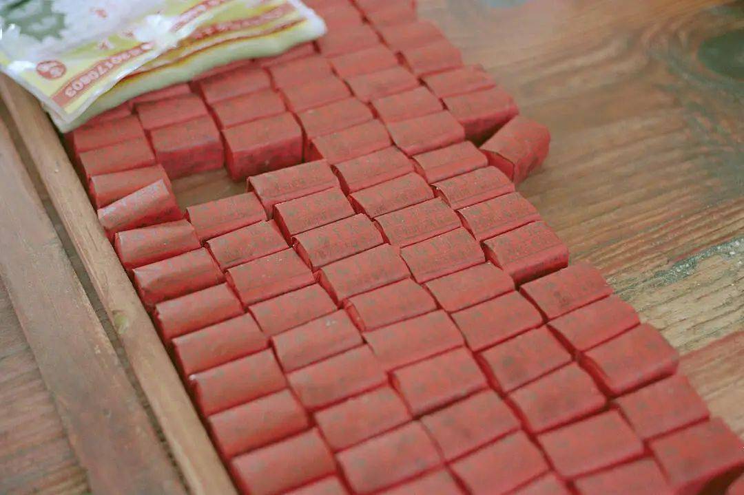 紅紙包是用芝麻、面粉和麥芽糖制作成的點心,切成橡皮擦大小的一塊塊,再用紅紙包裝。這種點心本來有自己的名字,因為制作時要將所有材料一遍遍搟壓疊層,所以就叫“千張酥”,但人們圖省事,就用“紅紙包”稱呼它。邢瑞端來幾盒紅紙包,我咬了一小塊,酥糖含在嘴里很快就化開,芝麻香溢出,也不特別甜。