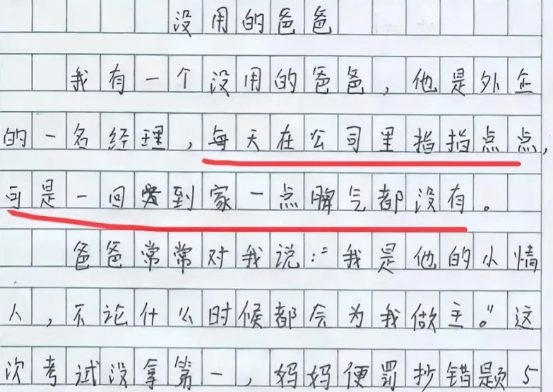 小學生用作文吐槽自己的爸爸沒有用,在公司當個經理,指指點點的,但是到了家,卻要被媽媽拿捏,反觀自己朋友家就不這樣,學生為此感到苦惱。