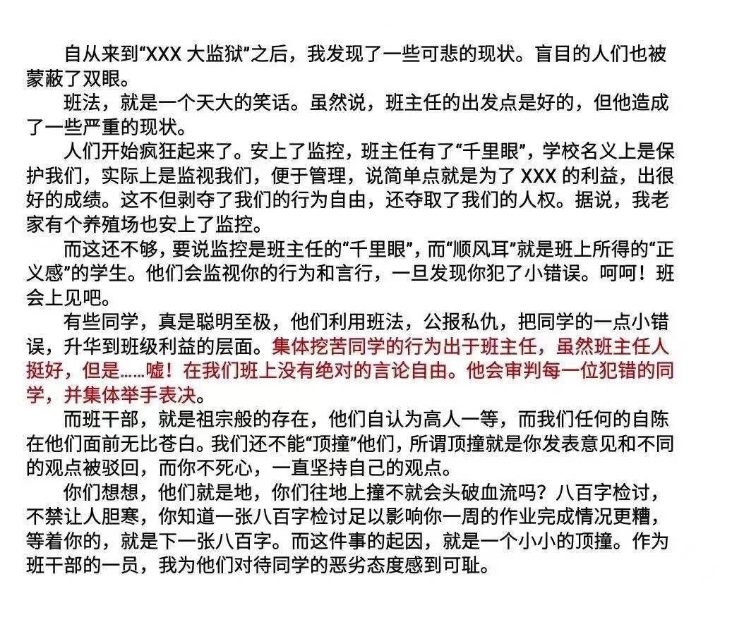 當她在網上發出這篇文章后,才突然感覺到解脫。曾經的學生紛紛轉發,之前體罰學生的年輕同事也留言,說后悔那些行為。可有個學生跟她說,自己準備和好友去找老師辯論舉報制度,被批評“搞小團體”,“你總相信在任何情境下,個體都是選擇的。可是我想告訴你,我們真的沒得選。”
