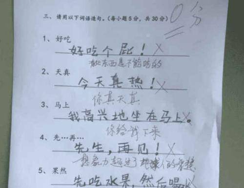 這位小學生就比較個性了,每一個句子都造得出其不意,每一個詞組都分開了,老師也是非常用心了,每一個造句都留了評語,相信老師在批這份卷子的時候也非常無語,否則也不會說“想象力超越了地球人的智慧!”
