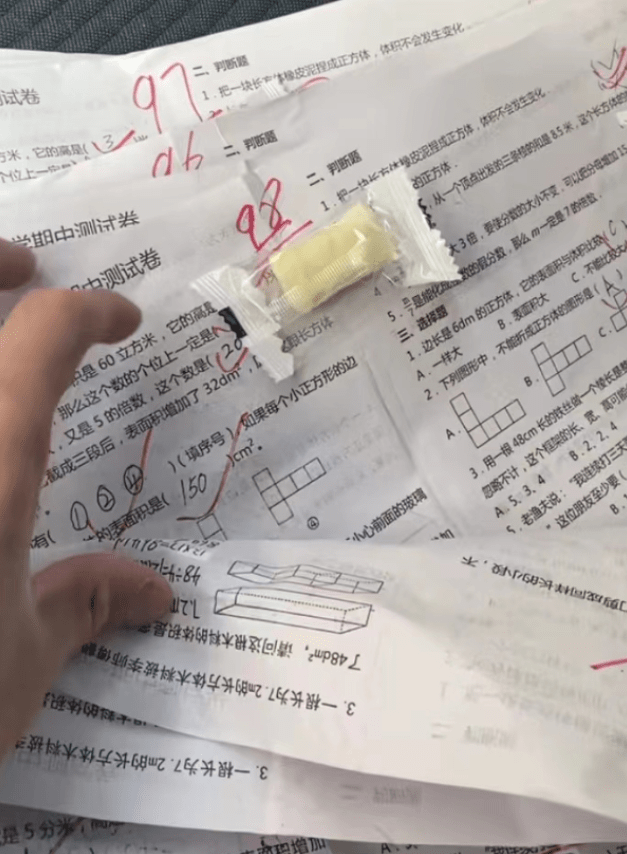 雖然只是一塊糖,但這塊糖里飽含老師對學生們的鼓勵,這樣的試卷,學生看到自然會愛不釋手,為了那句特別的評語,和這樣的小獎勵,考試也能變得讓人期待,真的很棒啊。