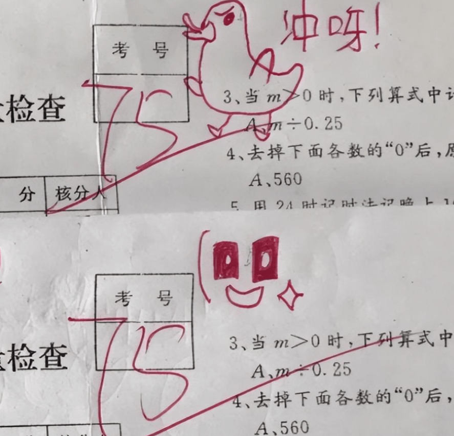 當然遇到一些成績遜色一些的同學,老師也不會直接棄之不顧,而是會在試卷上給予暖心的鼓勵,每人一個小表情包,學生以為會批評,結果老師如此暖心。