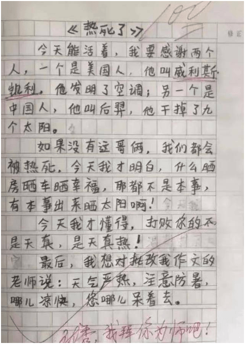 這位小同學就在作文里,就感謝了空調的發明者,同時還不忘感謝下神話故事中的后羿,如果沒有他倆,可能現在的人都會被熱死。