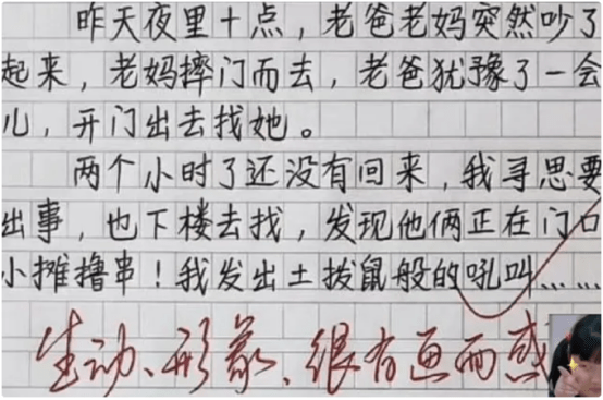 就像這位小同學寫的一樣,昨天晚上十點,老爸老媽突然吵架了,老媽摔門而去,老爸猶豫了一會兒,就開門出去找媽媽了,結果小同學在家等了兩個小時還沒等到爸媽回來。