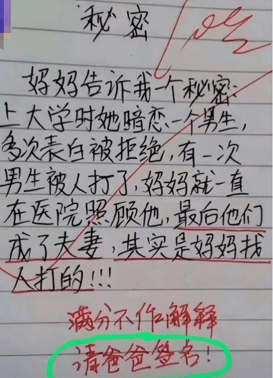 估計是這位媽媽在和其他人講述她的戀愛史的時候,被這位小同學給聽到了,于是媽媽的秘密就這么被曝光了,最后老師還“看熱鬧不嫌事大”的在下面寫了一句評語“請爸爸簽名”。