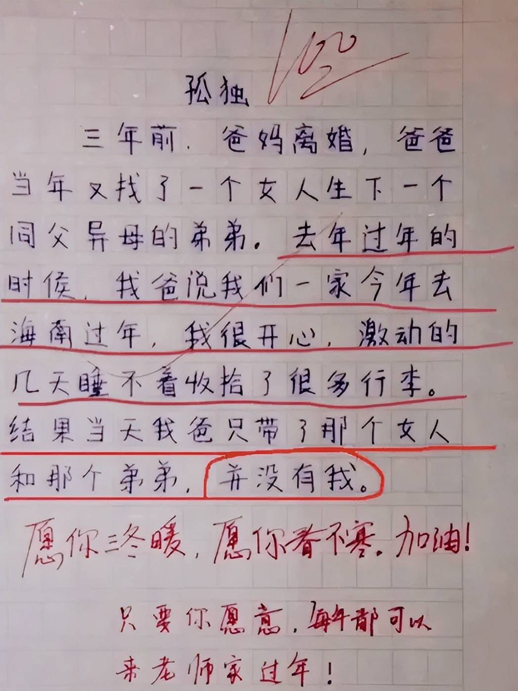 就例如這一篇,小學生作文《孤獨》得了滿分,老師含淚寫下三行評語,自此走紅,許多人看后也都不知該說些什么,網友紛紛直呼:心疼!學生確實很懂事,但往往都是會哭的孩子才有糖吃。