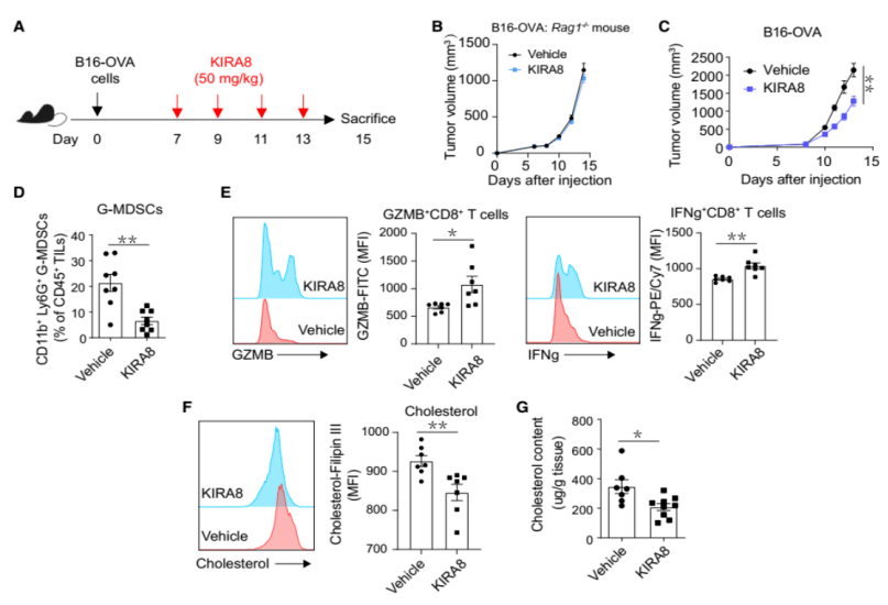 而在本次研究中,課題組考慮了免疫系統對腫瘤的影響,KIRA8 的效果也被顯示出來。同時也證實了:如果在免疫缺陷小鼠上接種 B16 黑色素瘤細胞,KIRA8 的確不會產生抗腫瘤效果。