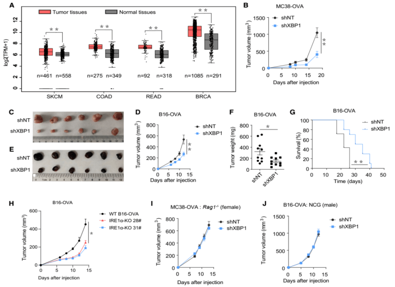 然而在免疫缺陷小鼠中,缺失 XBP1 的腫瘤細胞的生長速率并不受影響,只在接種到免疫系統完整的小鼠身上,才表現出明顯慢于野生型細胞成瘤的速率。這說明,腫瘤細胞的 XBP1 能通過某種方式來影響免疫系統,從而促進腫瘤生長。