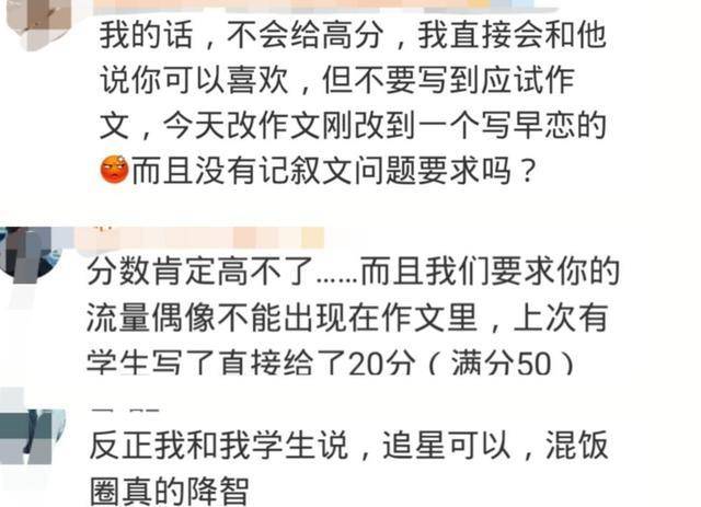 有老師明確要求學生不能寫,寫了直接給低分;有老師認為可以寫,但要往應試作文的方向去寫。歸根結底,老師們的看法是一致的,就是擔心學生把一篇應試作文寫成追星文、反黑文,寫成帶有飯圈色彩的文章。