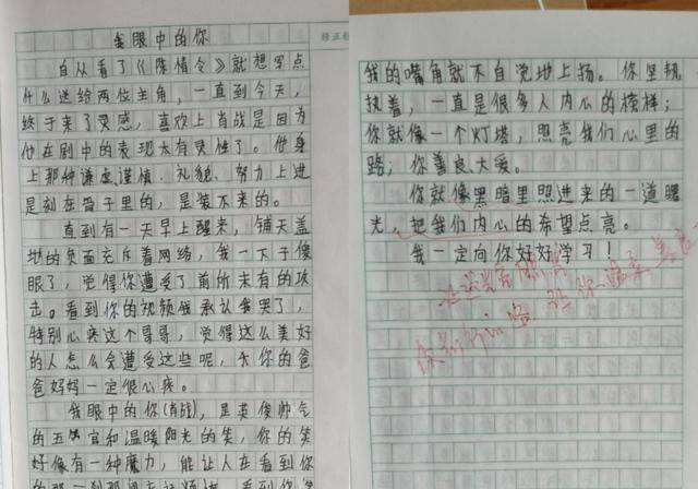 《我眼中的你》寫的是肖戰,亮點是結尾“我一定向你好好學習”,簡潔明了,但文章總體上很空,全文沒有實例,只有概括性的詞語和空洞的抒情。從老師給的評語來看,這應該是一篇隨筆,不是大作文。“希望這光亮照亮你前行的路,讓你更加溫柔、善良”,評語很溫柔,相信學生有被溫暖到。