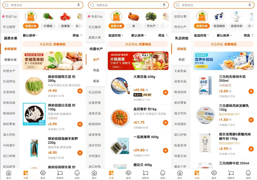 在多點APP中,系統根據用戶定位,提供與多點合作的商超、便利店等讓消費者選擇,消費者可在這些門店中線上購買商品。在部分商超門店中,產品涵蓋蔬菜水果、肉蛋水產、乳品烘焙、速食凍品、日用百貨等,根據不同的門店所銷售的產品,在平臺上的分類也有所區別。整體來看,各品類劃分較為細致,消費者能夠較為快速地找尋到想購買的產品。