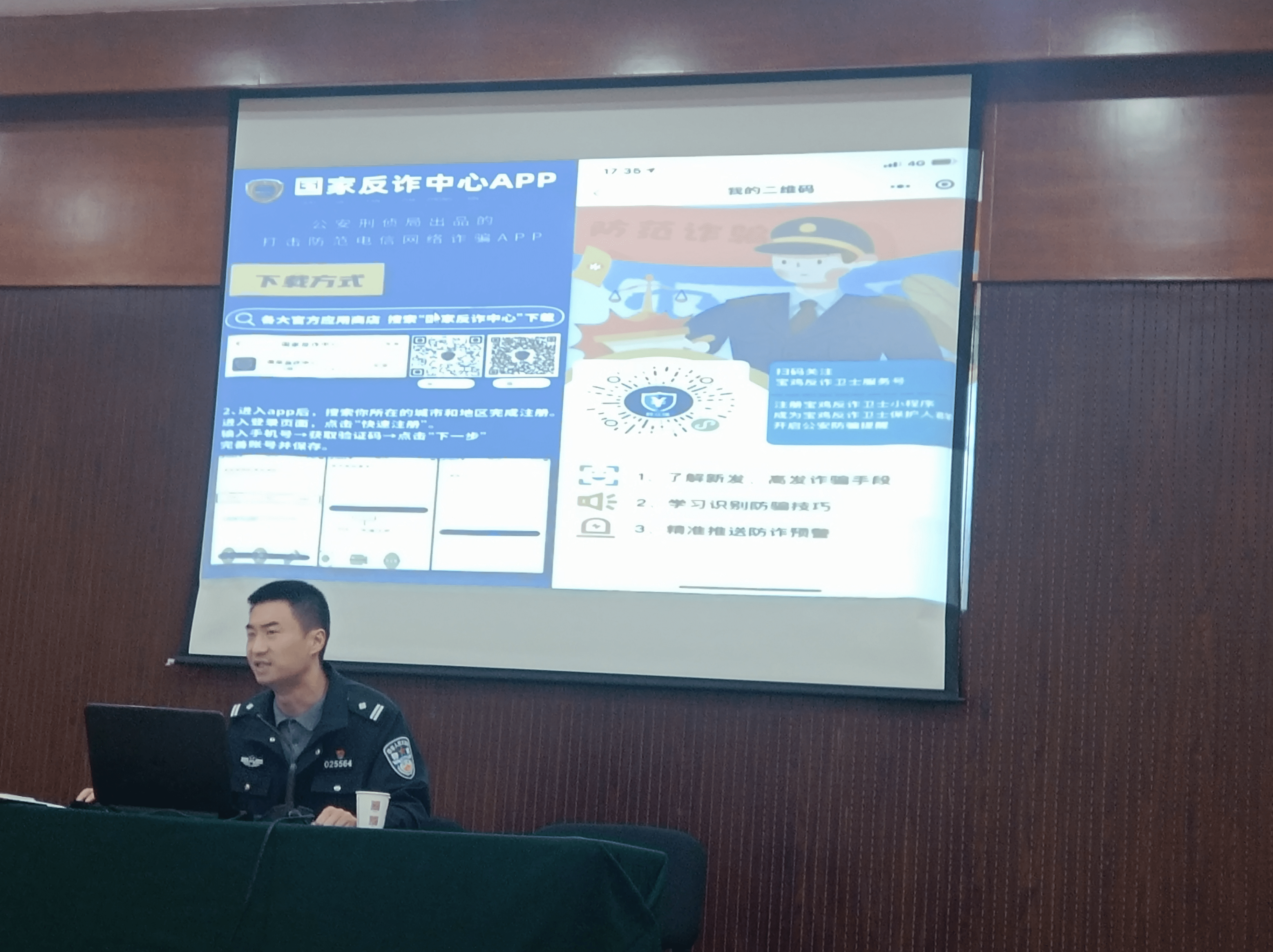 面對電信網絡詐騙愈演愈烈,且跨境作案偵破難度大的特點,張警官呼吁大家牢記“七個一律”,堅持“五不原則”,做到不理、不信、不匯款,遇有情況直接報警,避免財產損失。培訓會上,張警官引導大家下載了國家反詐中心APP,并掃碼關注了“寶雞反詐衛士”服務號。