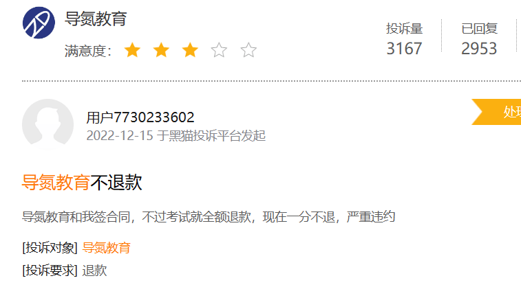 另一邊,導氮教育在黑貓投訴上的投訴量也多達3000余條,問題則同樣集中于協議班的退款問題,涉及學費在一萬至七萬不等。據《中國新聞周刊》此前報道,導氮教育拖欠千名學員上億元學費,多個線下分校均已停業,天津、廣州、西安、濟南、江蘇多地學員反映退費難的情況。