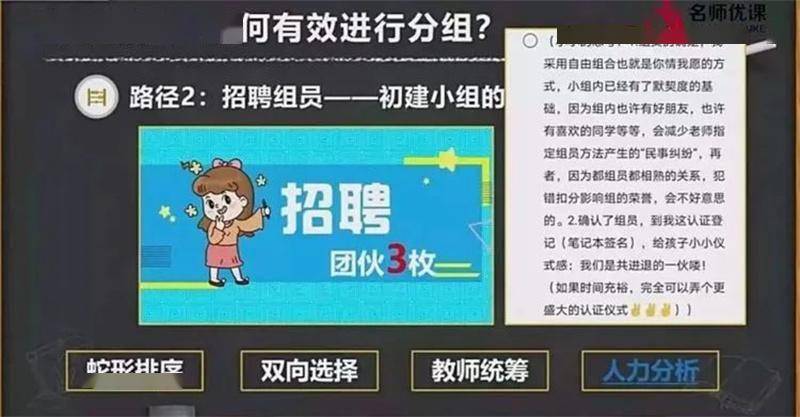 張老師以幽默風趣的風格讓會場的老師明白:小組合作首先在組長的選定上,我們要多方位考慮,將能力與成績進行比較,自薦與他薦進行結合,固定與輪流進行對比從而確定小組的領頭羊;其次,在組員的招聘上,我們要雙向選擇、人力分析更要蛇形排序來初建小組的共同體;最后就是特生的分配,要借同學們之力掃清小組的絆腳石。