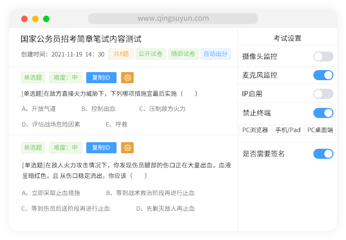 輕速云在線考試系統支持多場景考試,如考試考核、證書考試、每日一練、知識競賽、趣味答題、隨堂練習等。