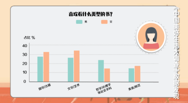 她們最喜歡看的圖書類型是:文學藝術、國學古籍和美食廚藝。均高于男性,而男性更喜歡讀哲學心理學等社會科學方面的書。