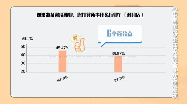 近年來,“靈活就業”成為社會關注的重點,如果靈活就業,女性朋友們最想開網店,占比達43.16%,特別是南方女性,想開網店的比例高于北方女性將近6個百分點。