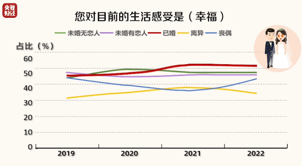 從不同生活狀態的女性來看,四年來,已婚女性的幸福感大部分時間高于未婚、離異等其他女性人群。離異女性幸福感最低,比已婚女性幸福感低了18個百分點以上。好的婚姻是相互成就,錯的婚姻會帶來無限煩惱。