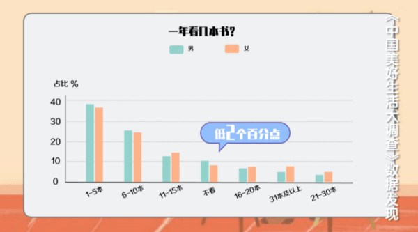 腹有詩書氣自華,現代女性把這句話體現到了極致,光從讀書量上就能看出一二。大調查線上問卷數據顯示,女性不讀書的比例僅為7.90%,比男性低了2個百分點以上。而且,女性每年讀11本以上書的人群比例均超過男性。