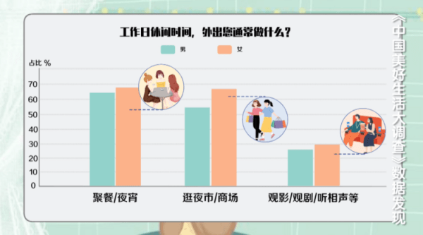 都說男性會瀟灑,愛社交,其實現代女性在這方面也一點不含糊,工作日的休閑時間,女性外出通常是去聚餐宵夜、逛夜市商場和觀影觀劇聽相聲等,夜經濟的火熱里,她們已然成了娛樂消費的主力軍。