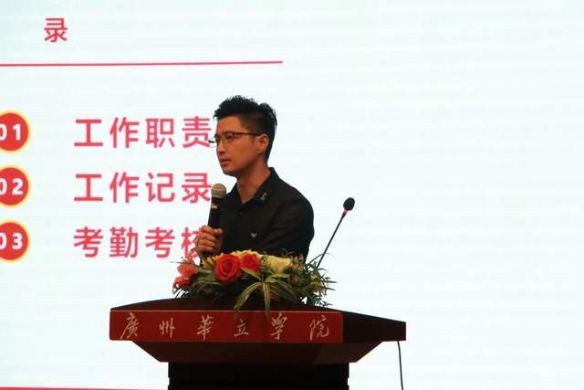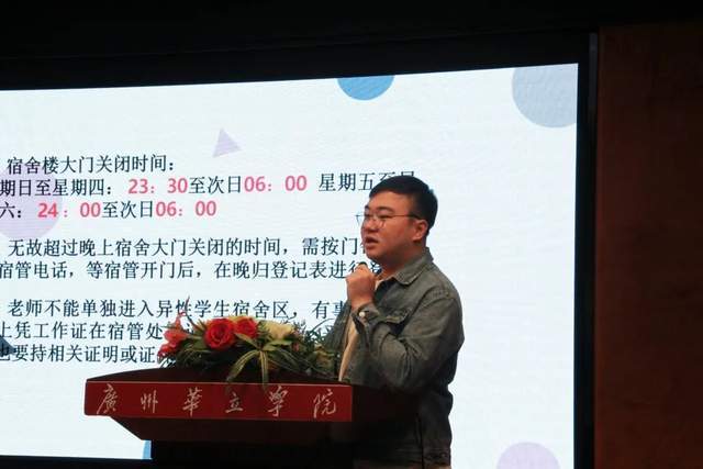 賴至烽老師在培訓中,對宿舍管理工作提出了具體要求。他以宿舍總體概況、宿舍管理系統及收費標準、水電管理、宿舍維修收費等管理、宿舍管理有關規定、宿舍工作辦事指南六個要點為主要內容,為學管人員講解了校園IC電卡的使用事項,熱水的供應及使用的注意事項,宿舍維修收費等管理以及報修方法和注意事項,退住宿差價及宿舍調整流程,投訴途徑與相關渠道,輔導員查寢的工作安排及注意事項等方面的內容。
