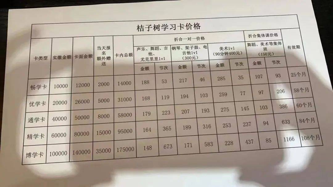 在上述家長提供的多份“桔子樹學習卡價格”表上,記者發現, 該機構的課包從1萬元到10萬元不等,10萬元的課包被稱為“博學卡”,最低1萬元的課包被稱為“暢學卡”。銷售分卡面金額、實繳金額和贈送金額,折合下來,購買10萬元的卡,可獲得17.5萬元的卡內總額。