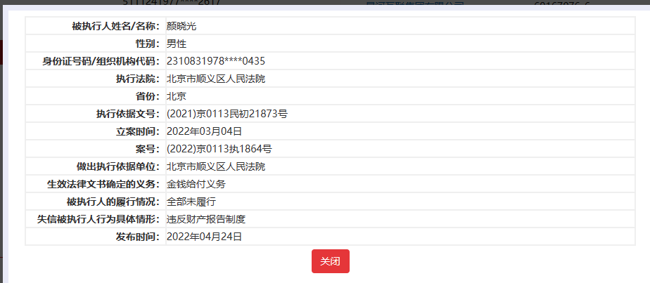 早在2022年3月,顏曉光便被列為“失信被執行人”,至今仍在法院系統上。圖/中國執行信息公開網