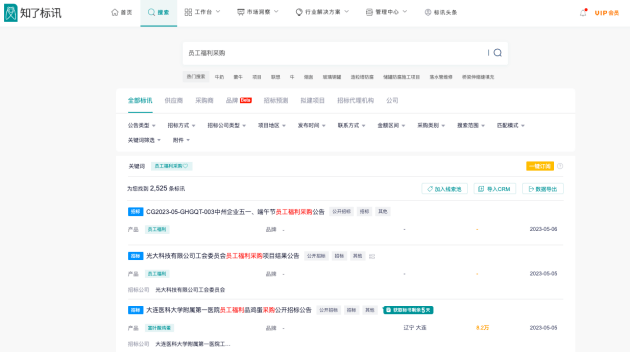 商超零售企業在知了標訊搜索“員工福利采購”、“節日禮品采購”、“企業慰問品”等關鍵詞,就能實時查看到相關招標項目,并可直接觸達項目聯系人。如果想進一步深挖潛在客戶,商超零售企業還可以通過產品或競爭對手的中標數據看板,查看相關產品或直接競對的采購商信息,更有策略地拓展潛在客戶池。