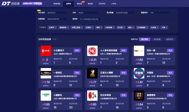 Aideas智能營銷市場的店店通模塊,匯集了餐飲業全量門店數據、主流地圖信息、主流生活資訊信息和工商數據,構建海量“門店-品牌-企業”知識庫,幫助企業洞察市場動態,快速精準觸達品牌及門店。
