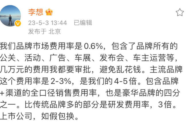 對此,理想汽車創始人李想回應稱,理想品牌市場費用率是0.6%,包含了品牌所有的公關、活動、廣告、車展、發布會、車主運營等,“幾萬元的費用我都要審批,避免亂花錢。主流品牌這個費用率是2-3%,是我們的4-5倍。包含品牌+渠道的全口徑銷售費用率,也是豪華品牌的四分之一。比傳統品牌多的部分是研發費用率,3倍。上市公司,如假包換。”