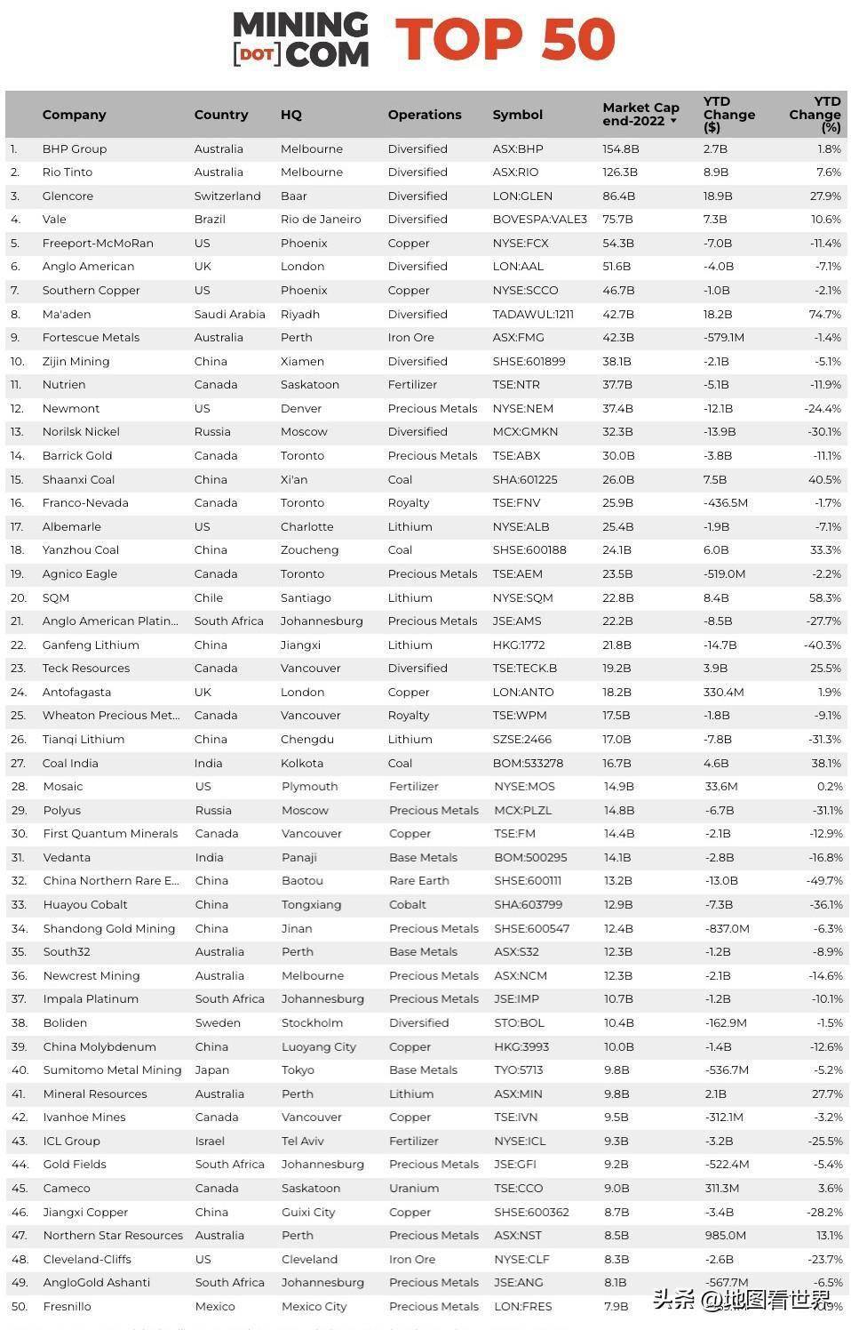 加拿大不僅礦產資源豐富,開采技術也世界領先。加拿大很多金剛石礦位于北極圈內,仍然可以進行露天或井下開采;雖然加拿大的礦井不是最深的,但是1000米以上的深井數量在世界各國中位居榜首。在2020全球礦業公司50強榜單中,加拿大有12家上榜,公司數量最多。在2022全球礦業公司50強榜單中,加拿大公司有9家。