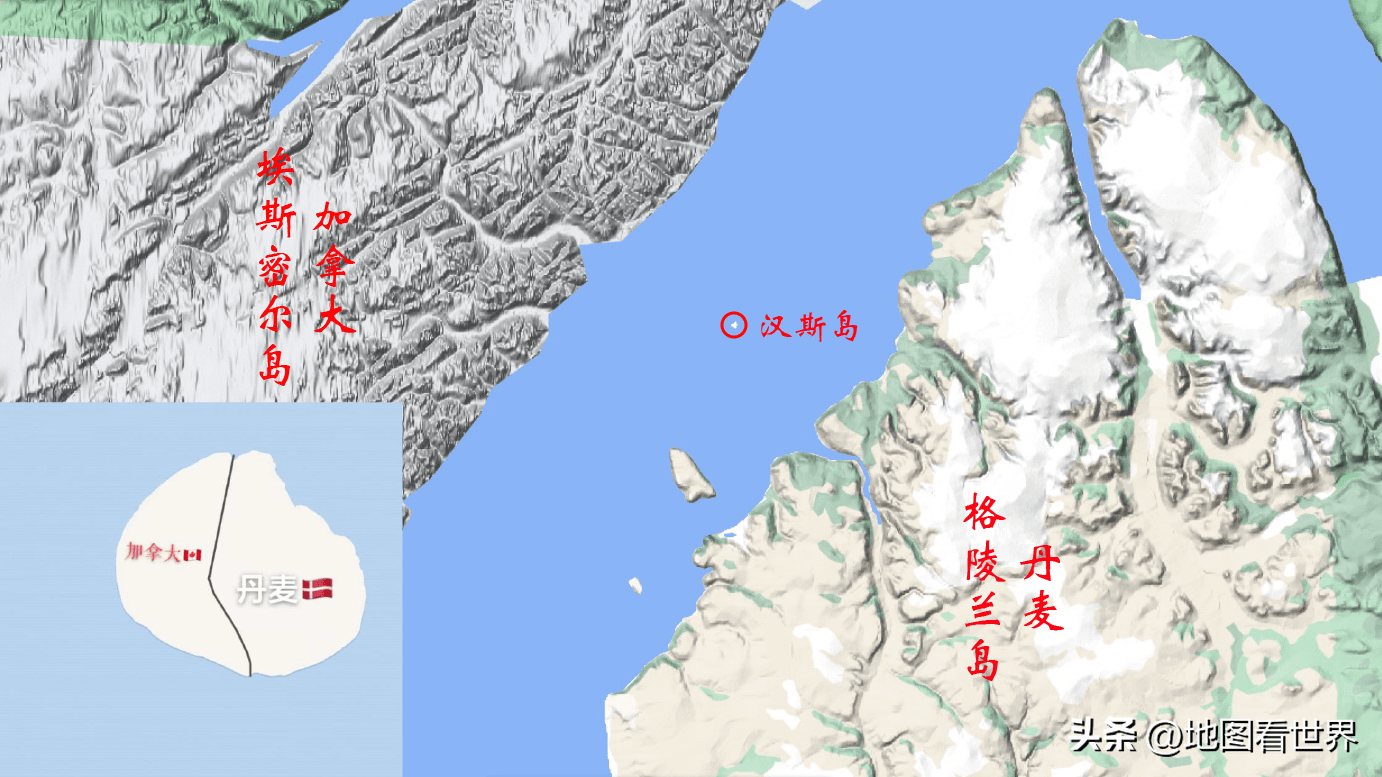 羅賓遜海峽寬度從18公里到29公里不等,可以說加拿大和丹麥最近距離為18公里。再放大地圖看看,就發現在內爾斯海峽中有一個小島——漢斯島。漢斯島荒無人煙,常年被冰雪覆蓋,面積僅1.3平方公里。加拿大和丹麥于2022年6月簽署新的邊界協議,將漢斯島一分為二,從而使兩國正式成為陸地接壤國家。因此, 與加拿大接壤的國家不再是美國一個,丹麥成為第二個與加拿大接壤的國家。