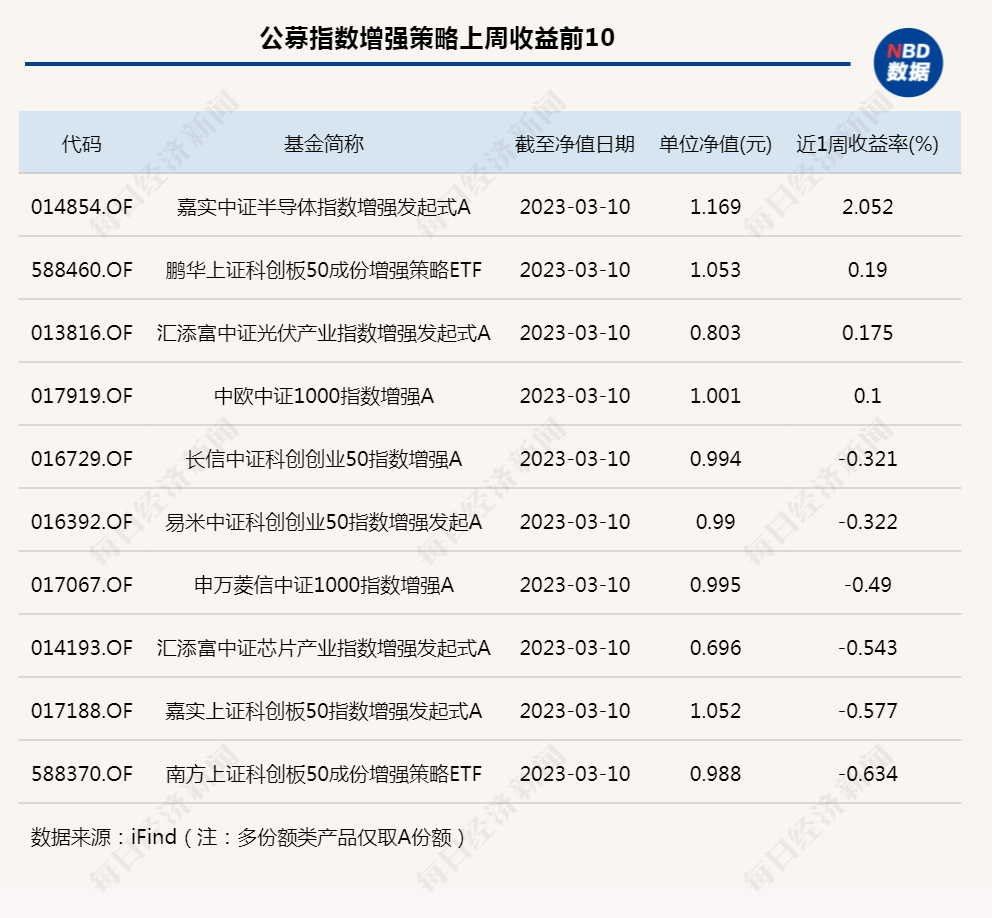 具體指增產品方面,嘉實中證半導體指數增強發起式A以超2%的周收益一馬當先,科創50增強ETF、匯添富中證光伏產業指數增強發起式A和中歐中證1000指數增強A上周微漲,前10中剩下6席也只是相對虧損較少了。跟蹤指數分布方面,排在前列多為跟蹤科創50及科創創業50指數的產品,半導體、光伏和芯片等主題指數也有相對突出的產品。
