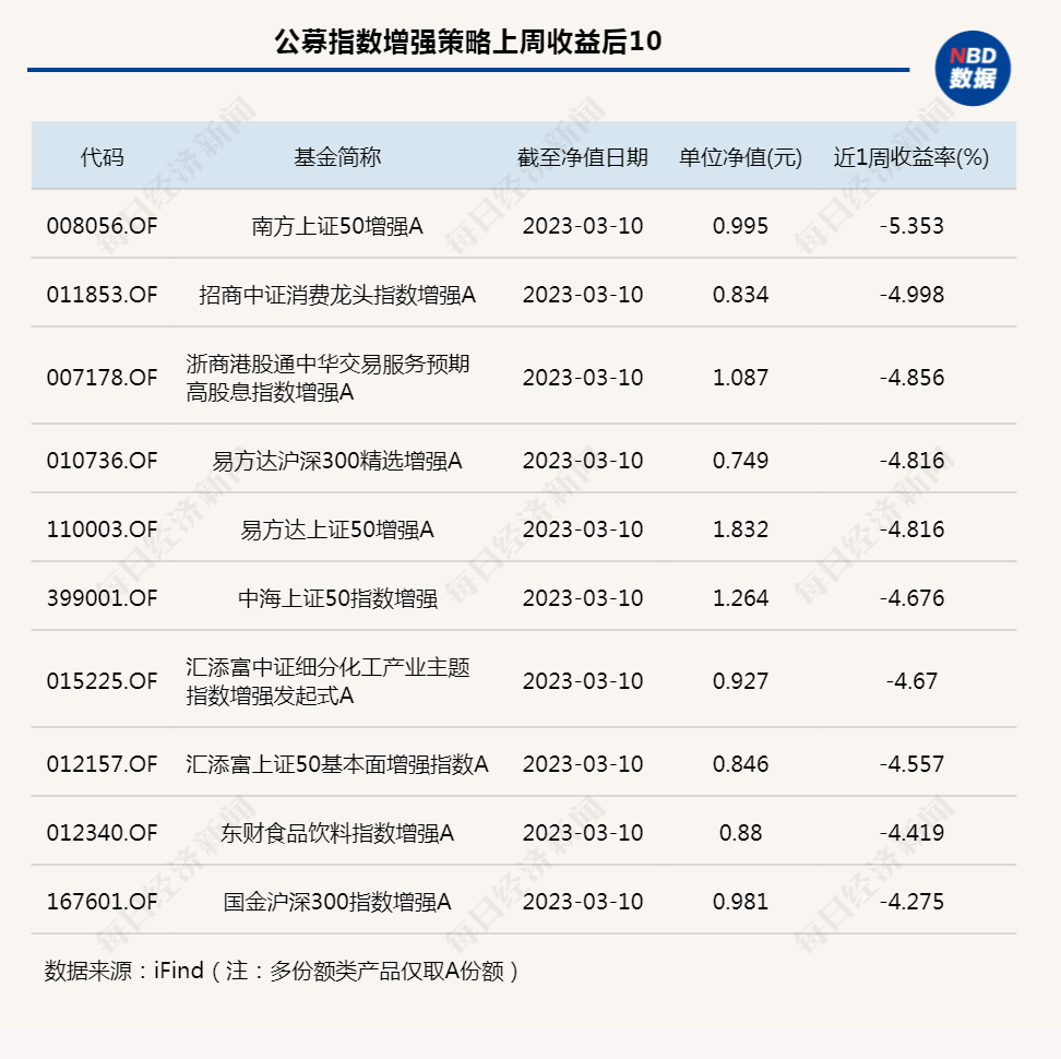 在指增產品“黑榜”上,上周“出鏡”率較高的是上證50相關產品,其次是滬深300指增類產品,消費等主題指數類產品也有入榜。同樣,黑榜TOP10跌幅整體也是較深,南方上證50增強A跌超5.35%領跌,其余跌幅也均超4.2%。側面反映出公募指增產品上周的超額表現并不太如意。