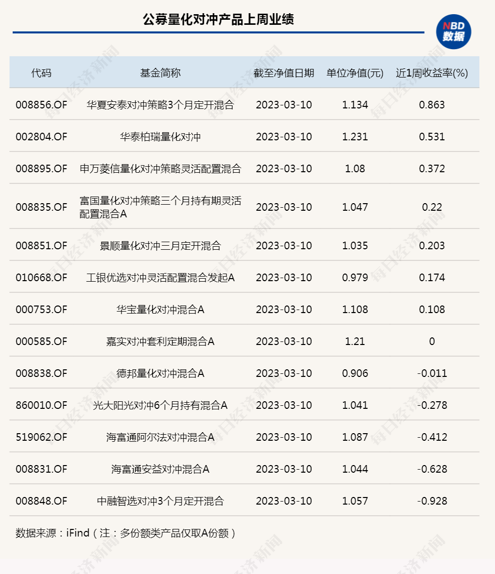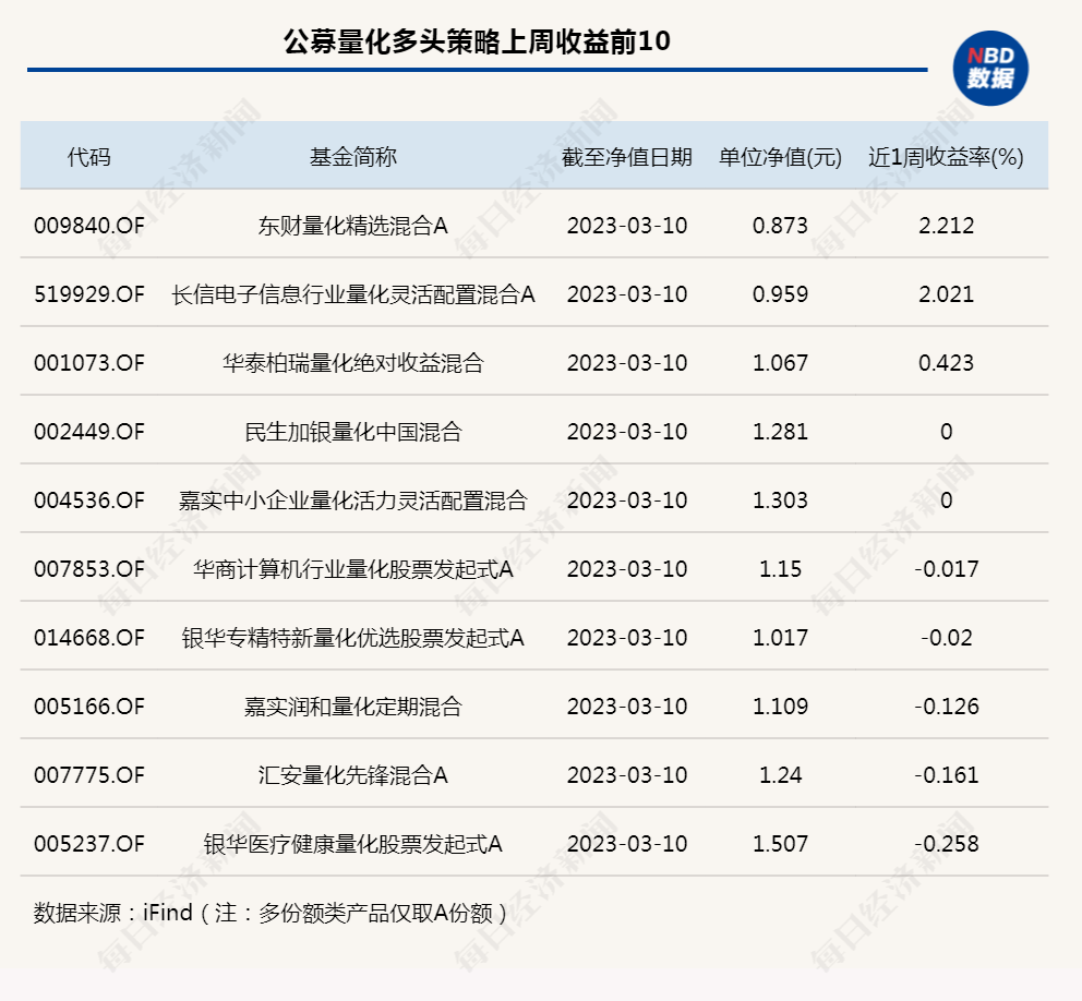 具體產品方面,東財量化精選混合A和長信電子信息行業量化靈活配置混合A以超2%的漲幅成為絕對收益“雙驕”,剩下一只正收益產品為華泰柏瑞量化絕對收益混合。另除民生加銀量化中國混合和嘉實中小企業量化活力靈活配置混合剛好“保本”外,前10產品剩下5席已是虧損,只是虧得相對較少,可見該策略產品上周的整體“慘淡”。