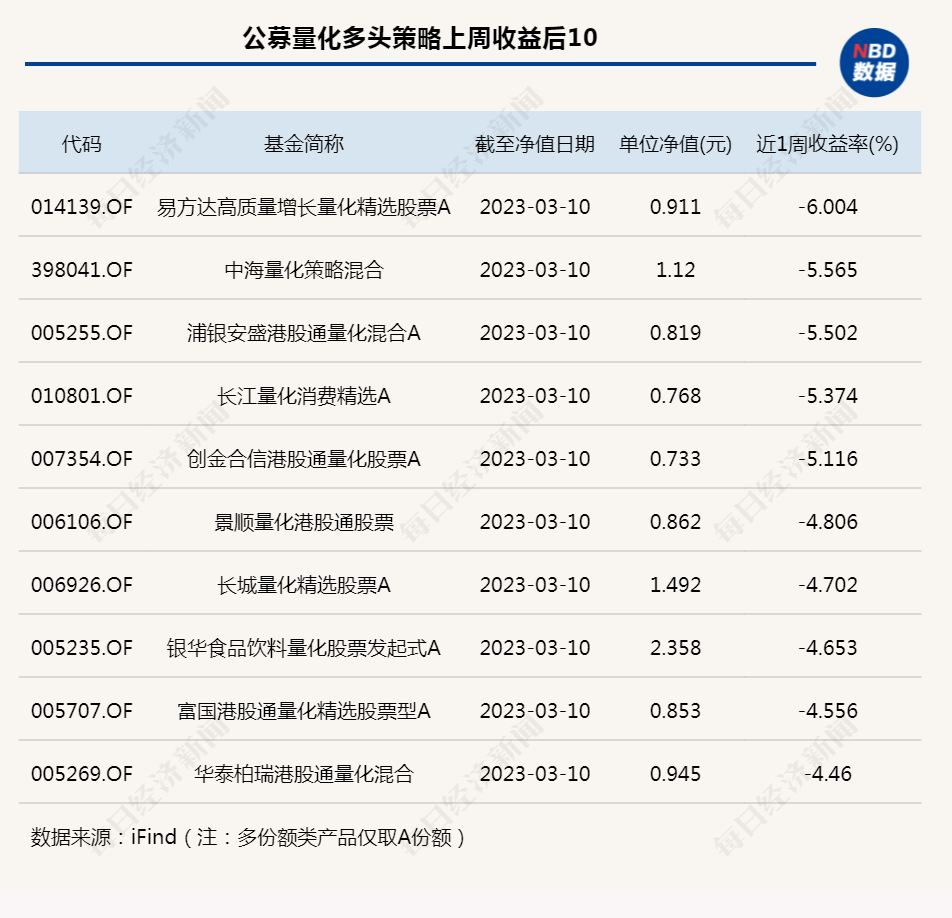 跌幅榜方向,易方達高質量增長量化精選股票A以超6%的周跌幅領跌,中海量化策略混合、浦銀安盛港股通量化混合A、長江量化消費精選A和創金合信港股通量化股票A跌幅也超5%。上周黑榜TOP10基本都跌超4.5%,第10名華泰柏瑞港股通量化混合也幾乎跌近4.5%,這在今年以來的行情中是非常罕見的。