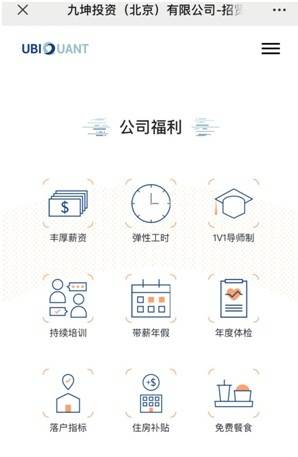 九坤投資招聘頁面提供的福利清單,除“豐厚薪資”“彈性工時”等常規操作,更有“落戶指標” “住房補貼”等一線城市珍稀資源。