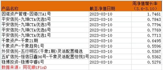 從具體產品來看,因諾資產旗下“因諾CTA1號”憑借1.73%的周收益奪魁,九坤投資旗下4款產品以0.78%左右的收益排在其后,上周該榜單的最大特征是:前5名都是CTA策略產品,可見股票策略難逃受市場整體下挫的影響。另外值得一提的是,千象資產上周也有4只產品進入前十,而且前40名中更是有近半為千象旗下產品,一掃該私募2月下旬霸榜“黑榜”的陰霾。